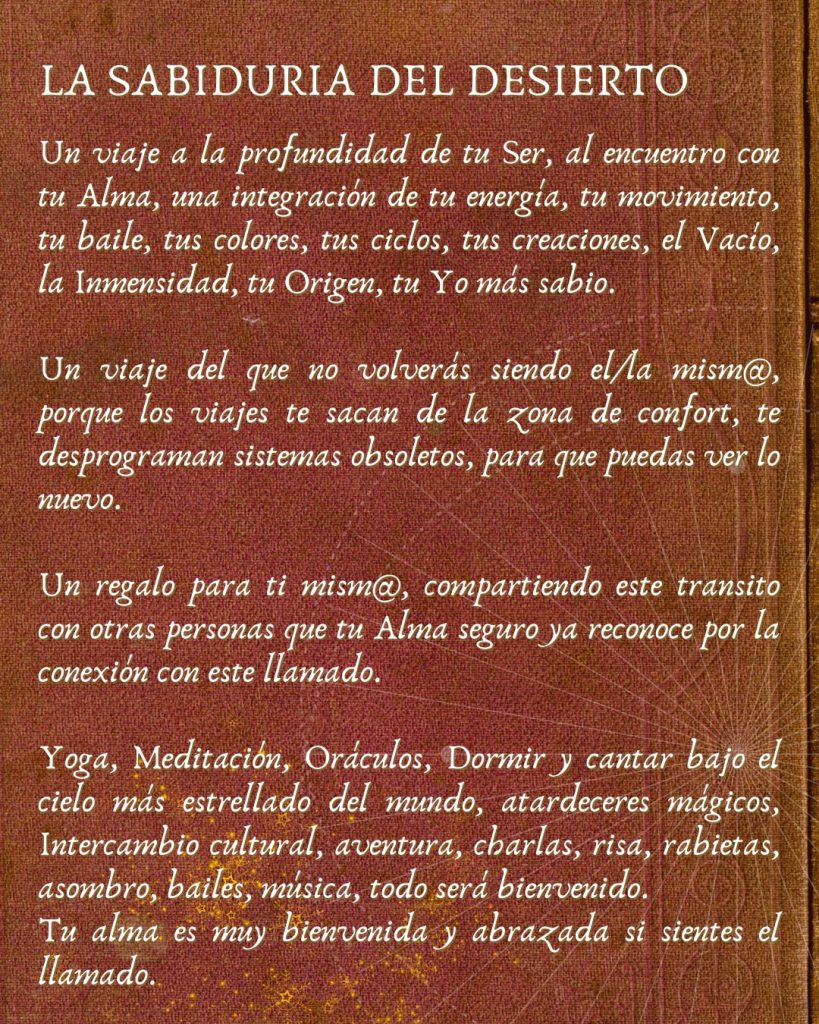 Yoga, Meditación, Oráculos, Dormir y cantar bajo el cielo más estrellado del mundo, atardeceres mágicos, Intercambio cultural, aventura, charlas, risa, rabietas, asombro, bailes, música, todo será bienvenido.
